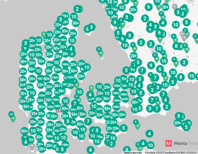 På billedet ses den ene station, ligesom vi har sat et kort ind med de allerede eksisterende ladestandere hos Norlys pt. i Danmark.